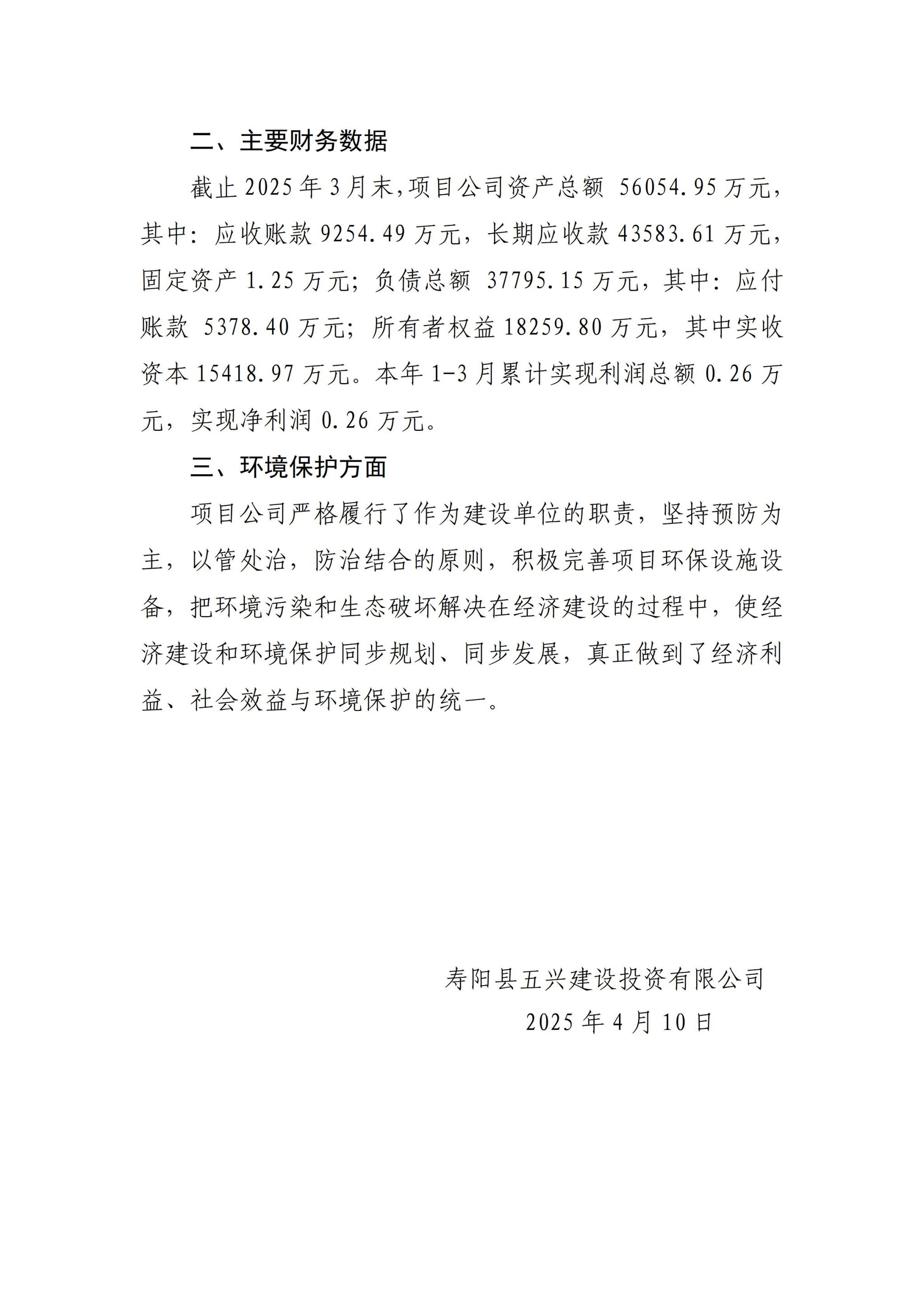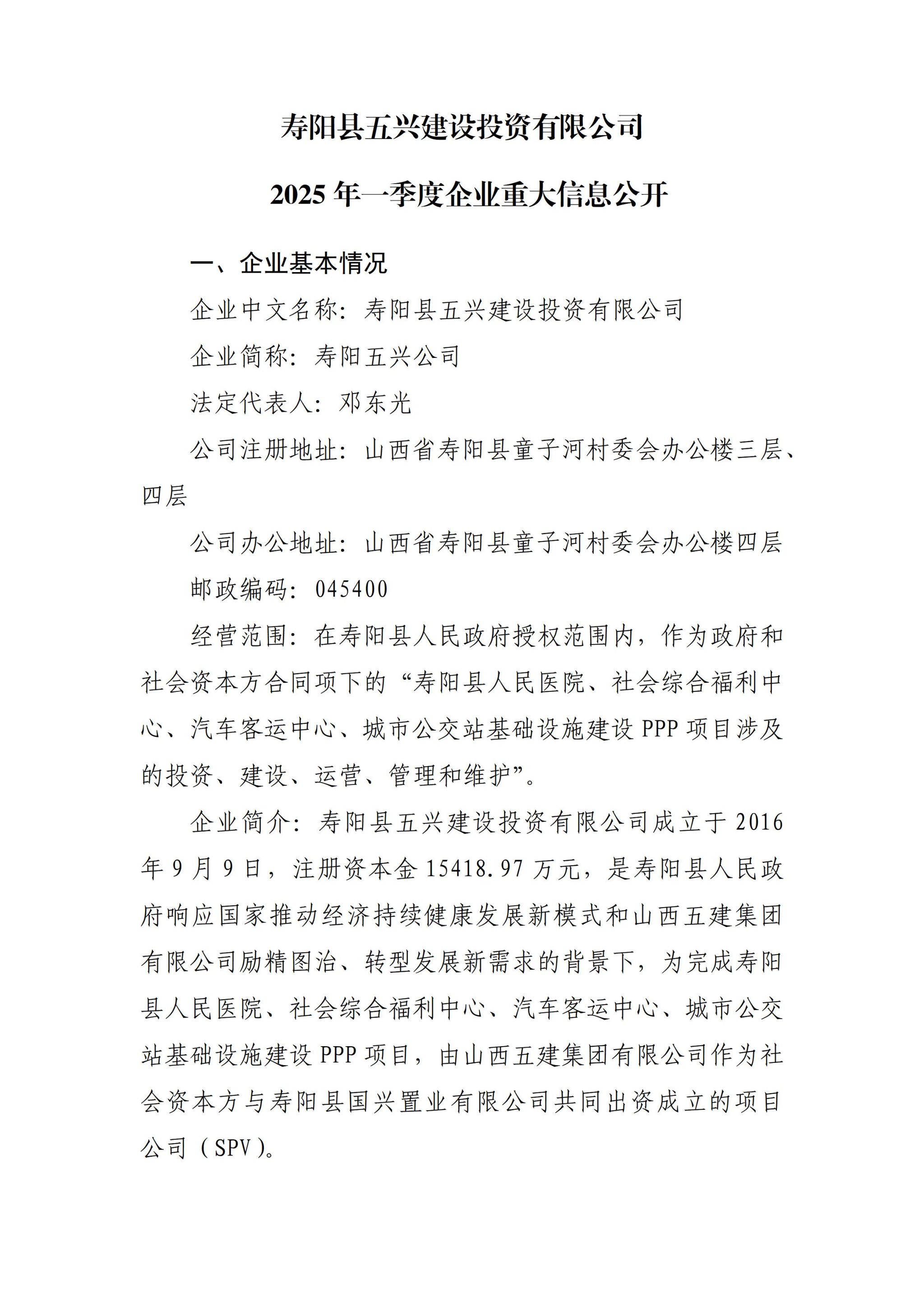 寿阳县五兴建设投资有限公司2025年一季度企业重大信息果真