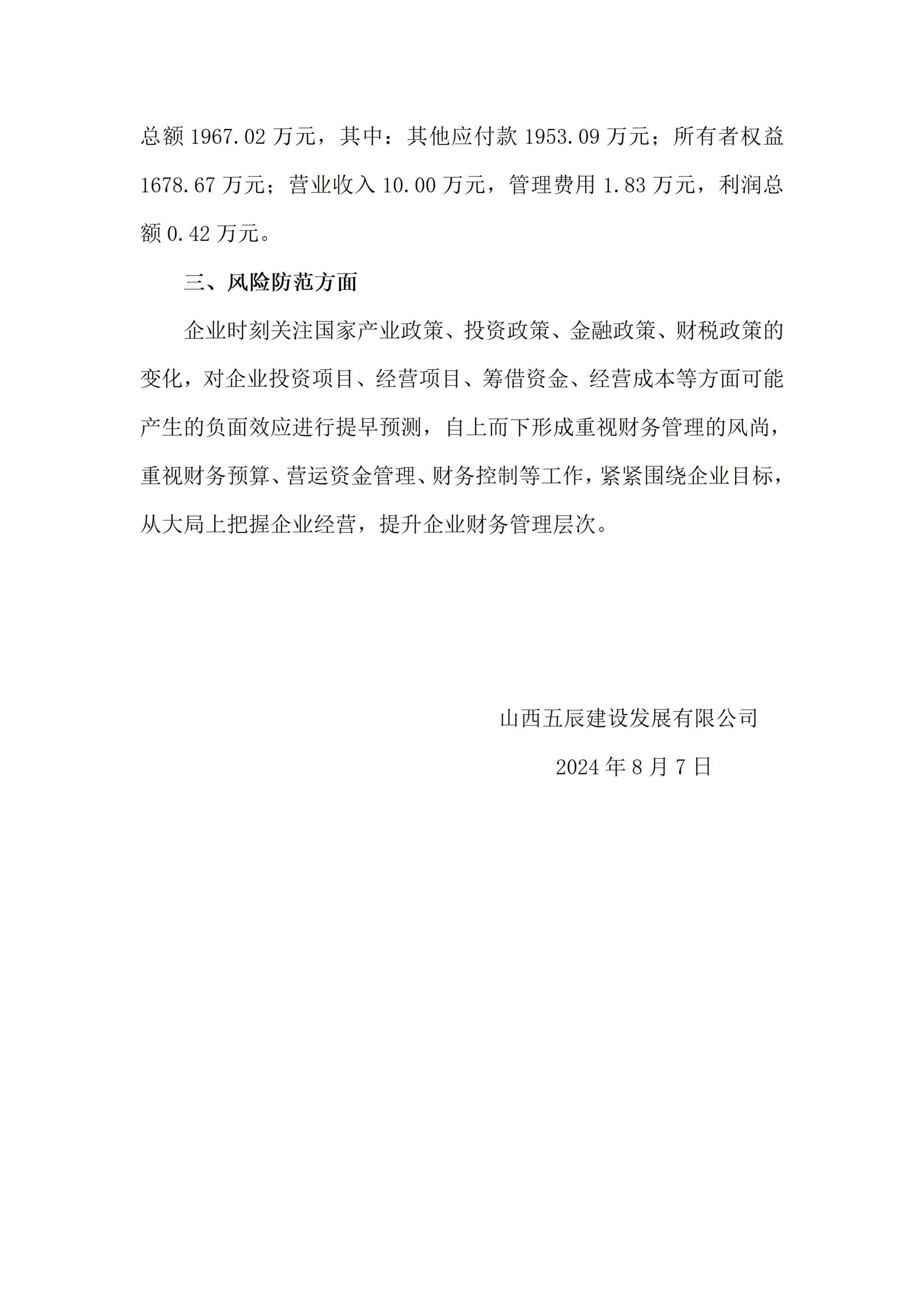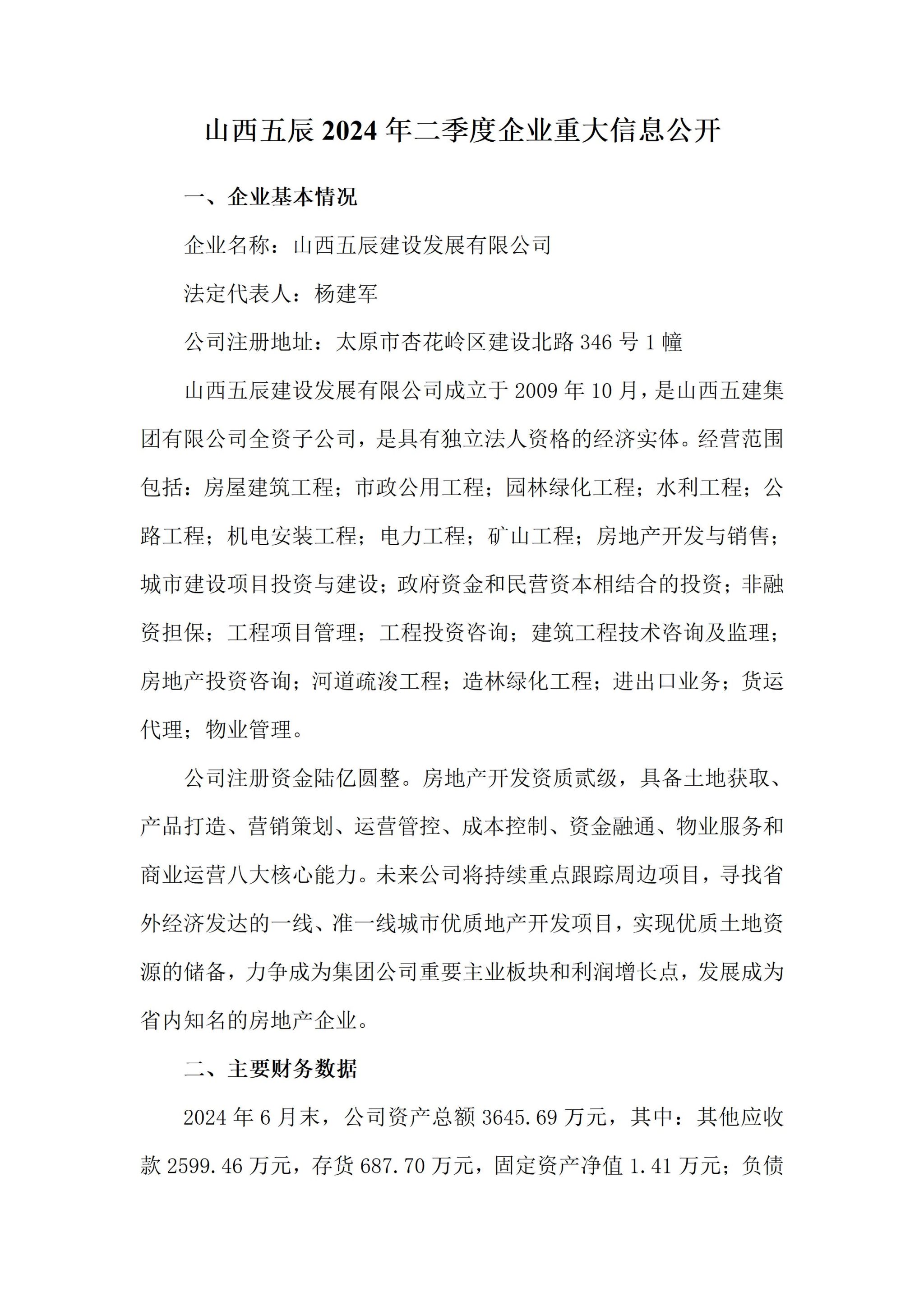 山西五辰建设生长有限公司2024年二季度企业重大信息果真