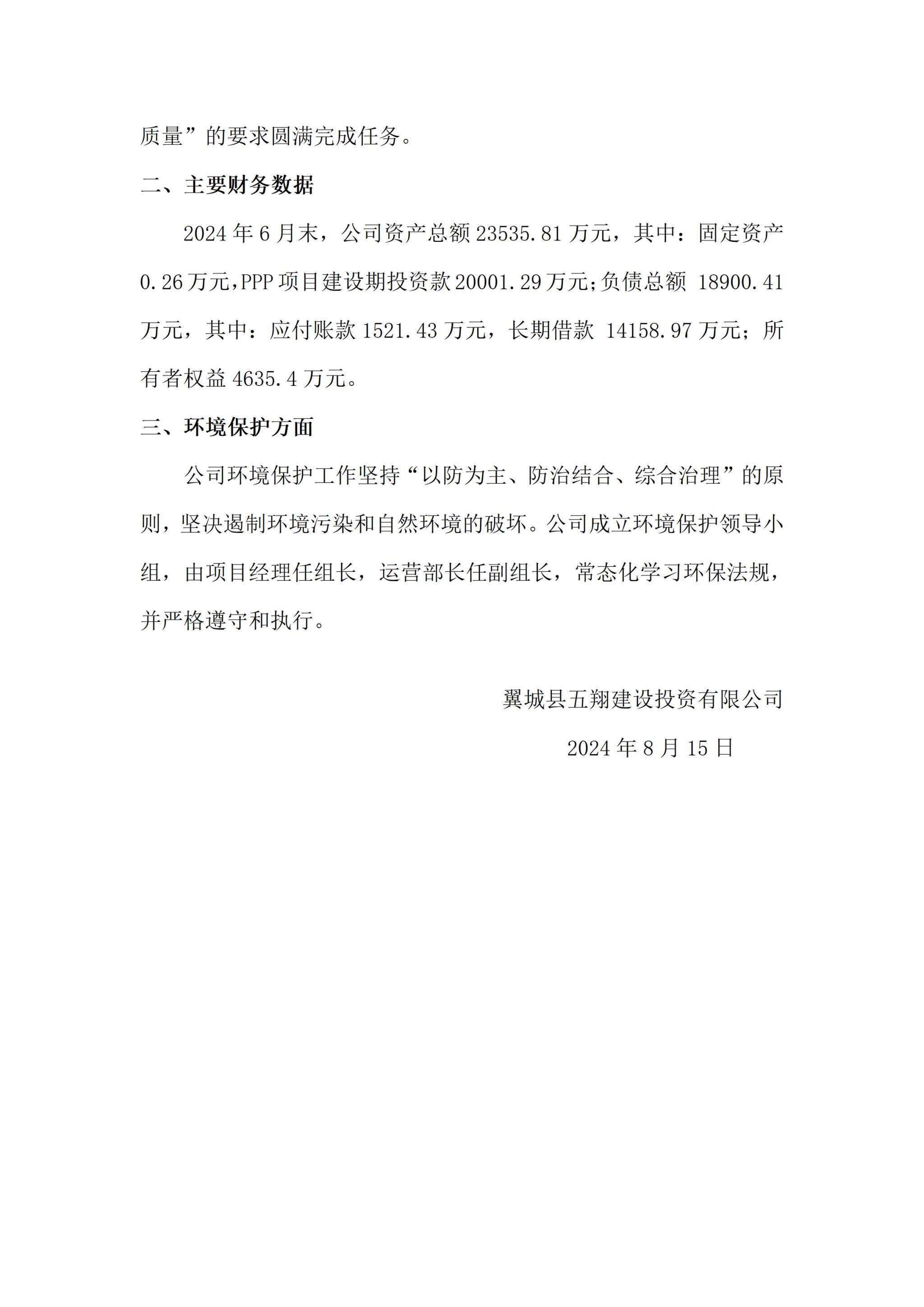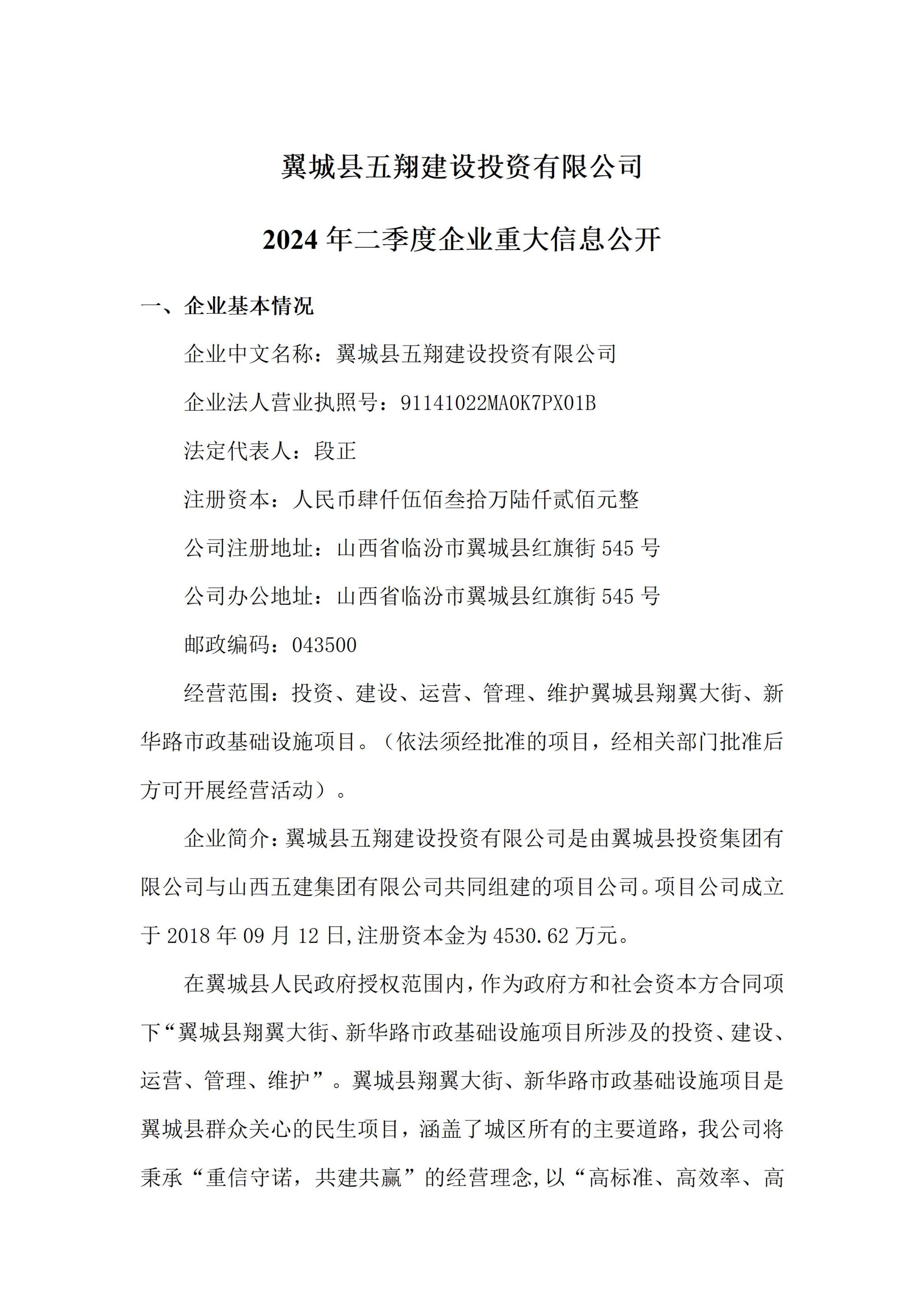 翼城县五翔建设投资有限公司2024年二季度企业重大信息果真