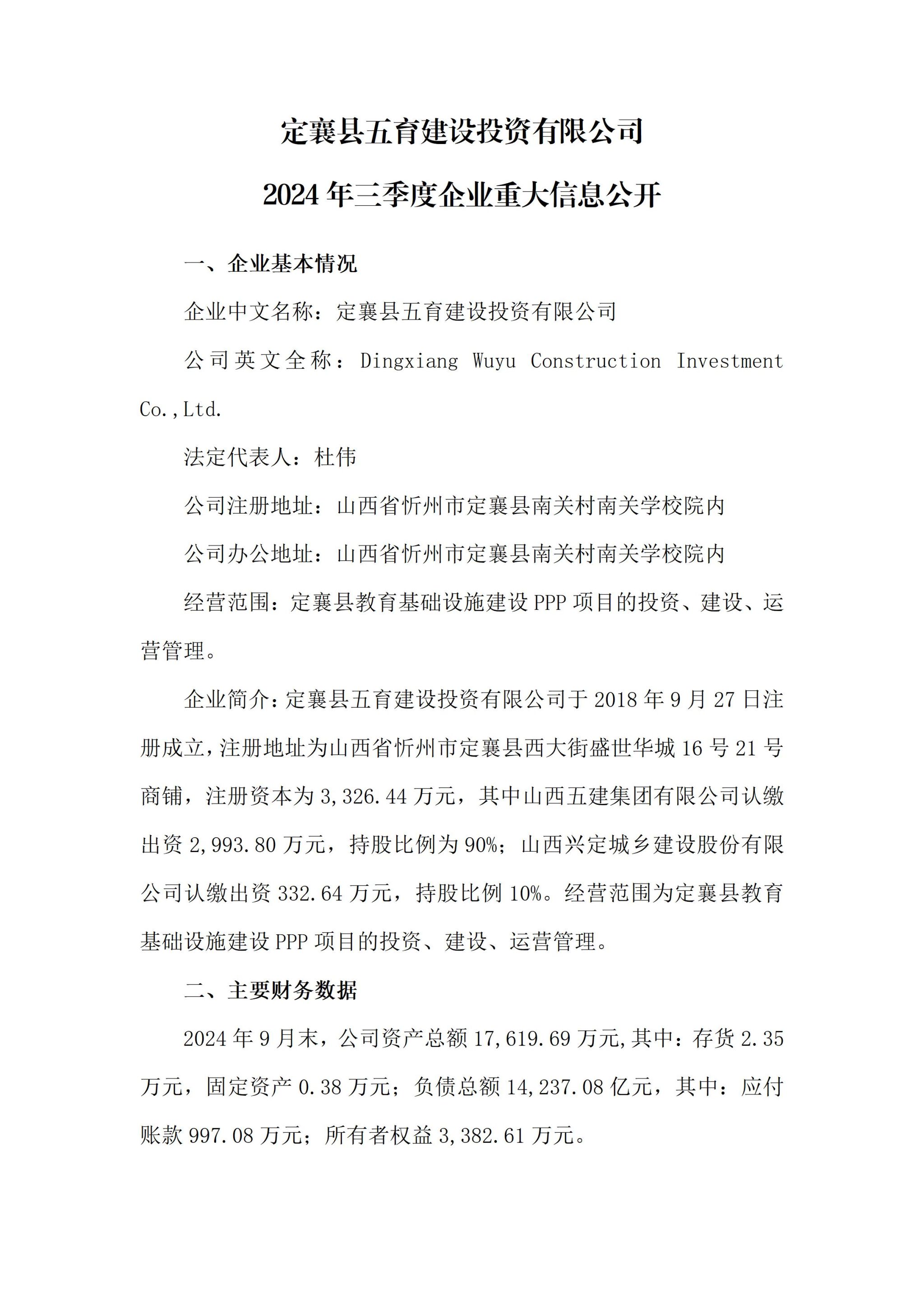 定襄县五育建设投资有限公司2024年三季度企业重大信息果真