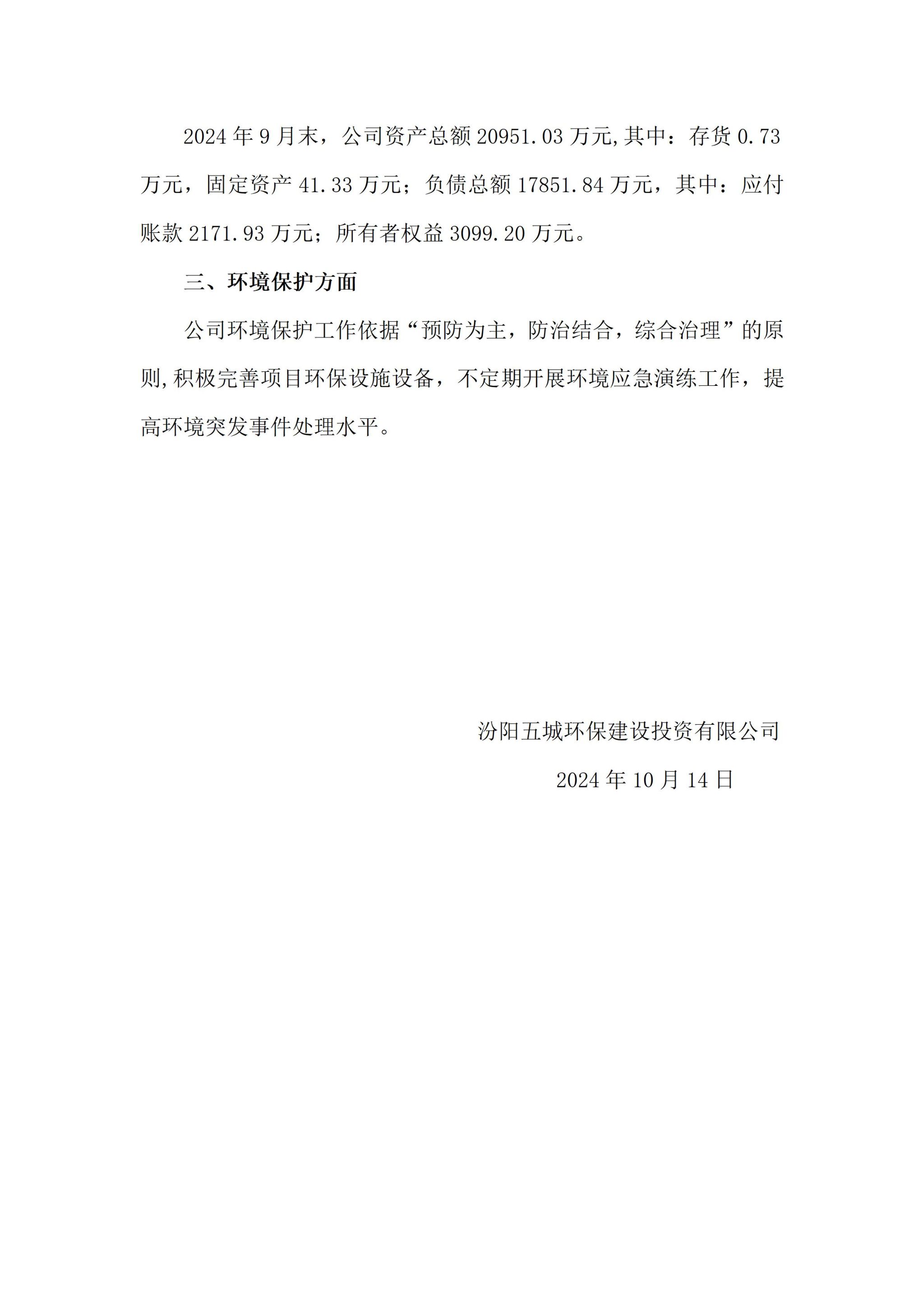 汾阳五城环保建设投资有限公司2024年三季度企业重大信息果真